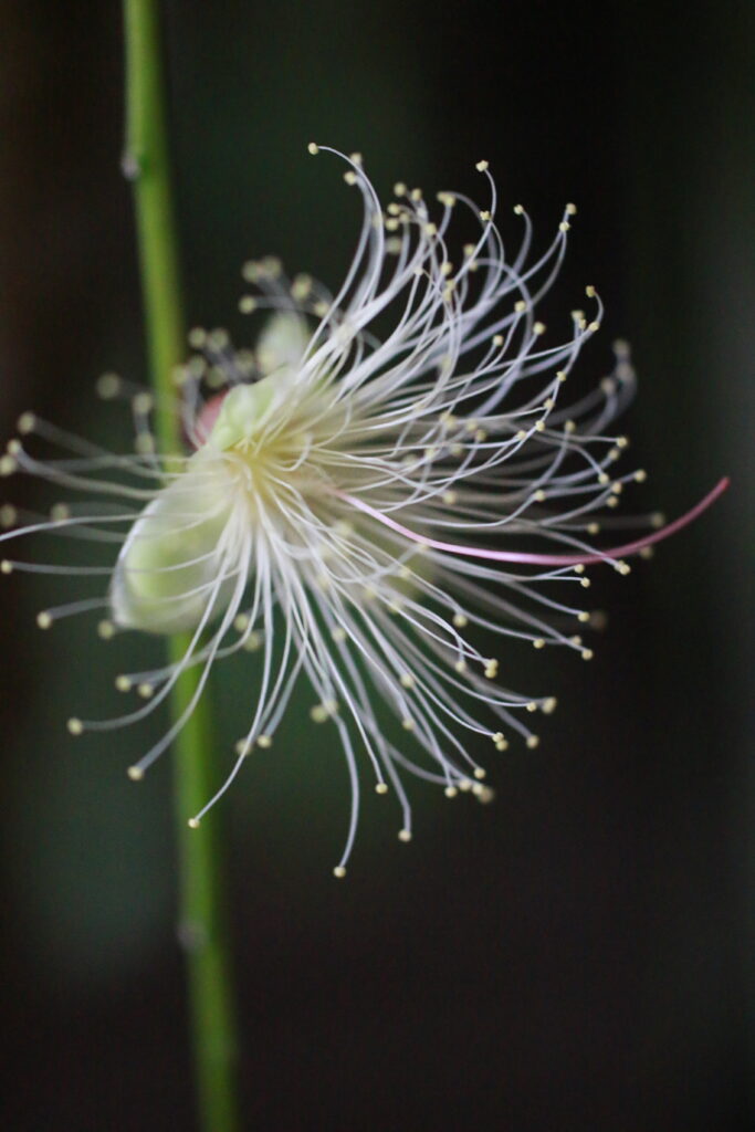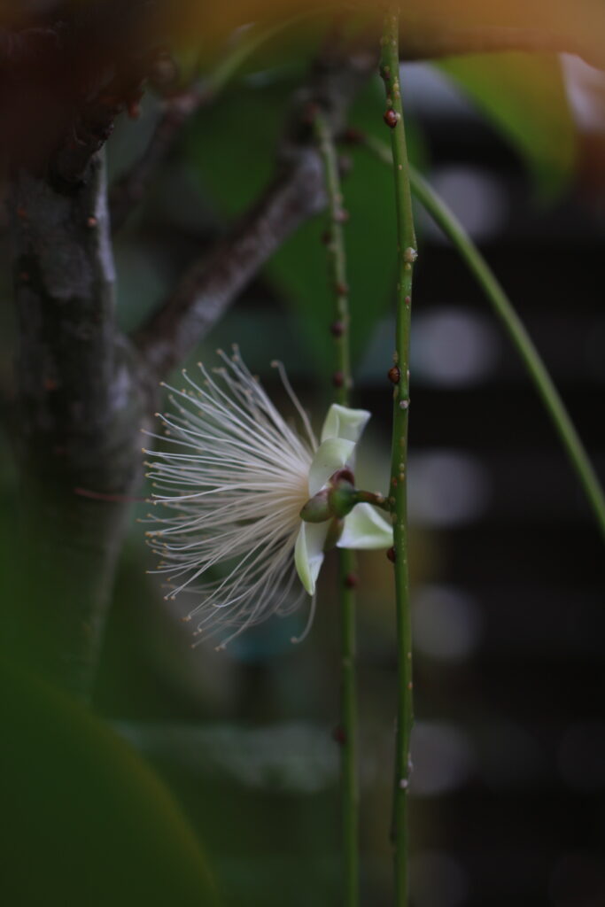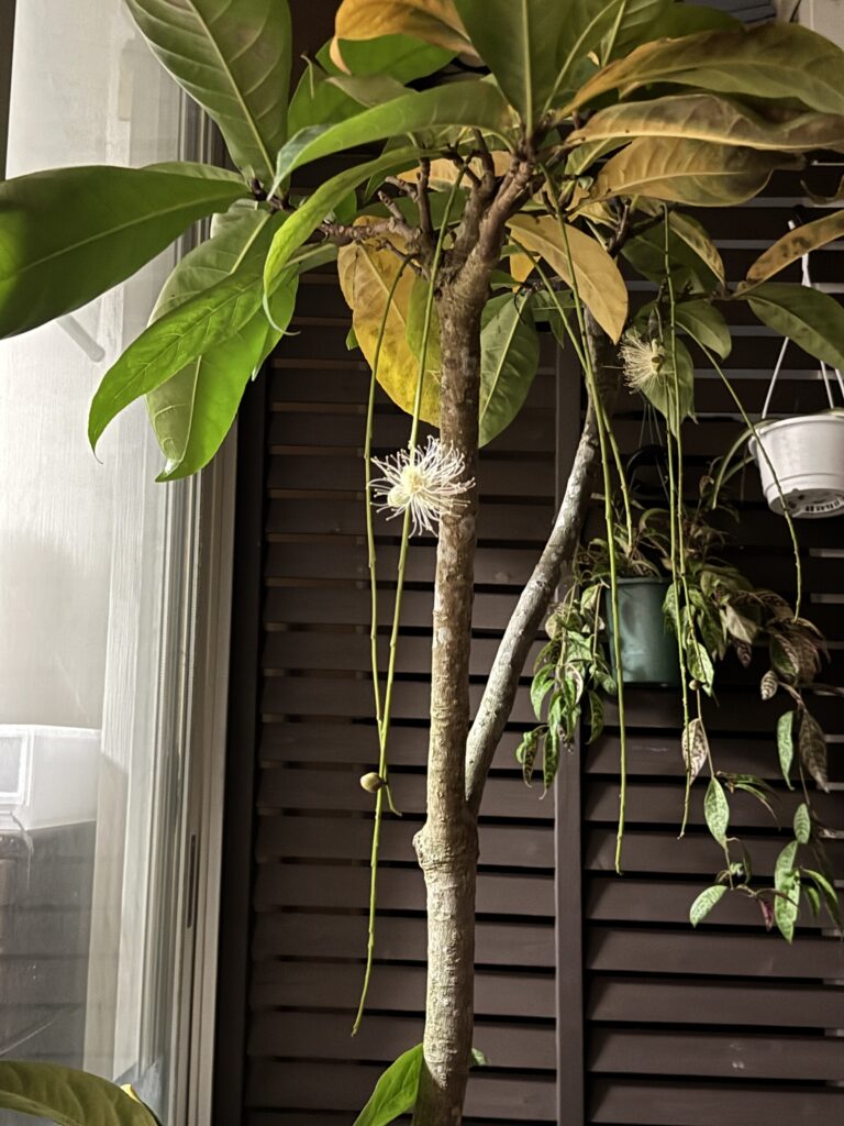 形状が珍しいのが気に入ってこの夏に我が家の一員になったものの 育て方を間違えました。ストレスで沢山あった蕾は一晩でほぼ落下。しかし残った四つは見事に花を咲かせ私たちを楽しませてくれました。西表島に生息し、夕方咲いて朝には散る下がり花